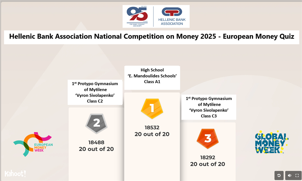 The winner was class A1 of the High School ‘E. Mandoulides Schools’ in Thessaloniki, followed by class C2 and class C3 of the 1st Protypo Gymnasium of Mytilene ‘Vyron Sivolapenko’ in Lesbos. The winning class will represent with two students its school and Greece in the European Money Quiz Competition, which will take place in Brussels on Thursday 22th and Friday 23th of May 2025.