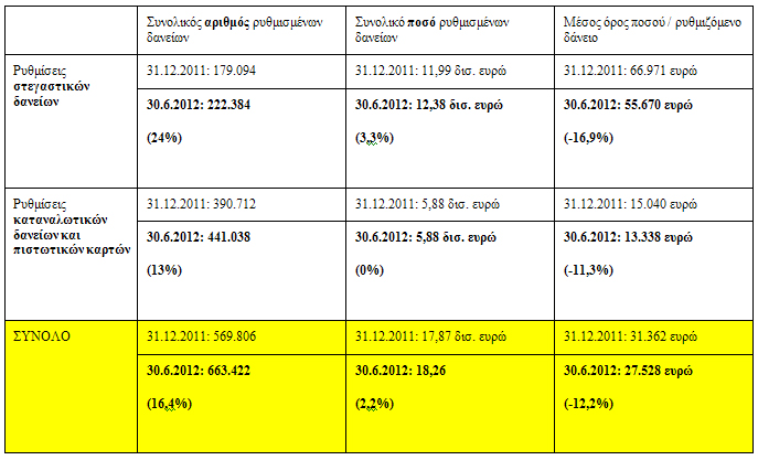 Ειδικότερα, σύμφωνα με στοιχεία των τραπεζών-μελών της Ελληνικής Ένωσης Τραπεζών (Πίνακας 1), προκύπτει ότι οι ρυθμίσεις των στεγαστικών και καταναλωτικών δανείων, συμπεριλαμβανομένων των πιστωτικών καρτών, παρουσίασαν, την 30η Ιουνίου 2012, σε σχέση με την 31η Δεκεμβρίου 2011, αύξηση του αριθμού κατά 16,4%. Επίσης, αποδεικνύεται ότι:
