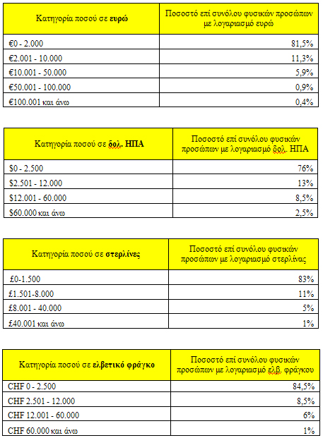 Την 30η Ιουνίου 2012, το 93% των φυσικών προσώπων-καταθετών των τραπεζών διέθεταν καταθέσεις συνολικού ύψους έως 10.000 ευρώ, ενώ μόλις το 0,4% αυτών είχαν καταθέσεις άνω των 100.000 ευρώ, ποσό που συνιστά και το ανώτατο όριο αποζημίωσης ανά καταθέτη από το Ταμείο Εγγύησης Καταθέσεων και Επενδύσεων (ΤΕΚΕ). Αντίστοιχα ποσοστά παρατηρούνται και στα λοιπά βασικά διεθνή νομίσματα (Πίνακας 2).