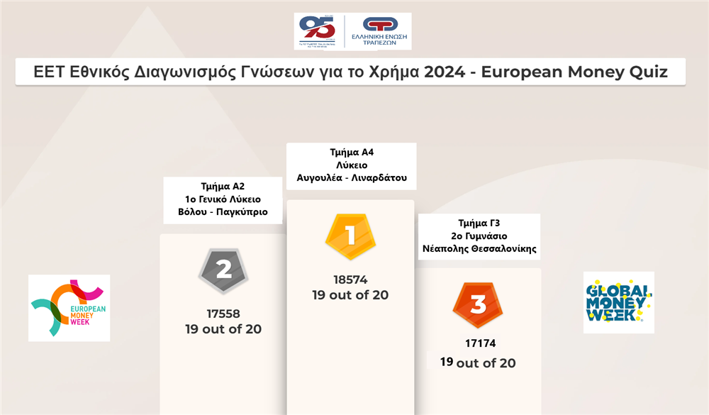Στο πλαίσιο αυτό, η Ελληνική Ένωση Τραπεζών ολοκλήρωσε με επιτυχία στις 20 Μαρτίου 2024, τον Έβδομο Εθνικό Διαγωνισμό Γνώσεων για το Χρήμα “European Money Quiz”.