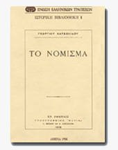 Αναστατική έκδοση του βιβλίου του Γ. Κατσελίδη, Το Νόμισμα, που κυκλοφόρησε το 1902. Ο συγγραφέας του υπήρξε ιδρυτής και εκδότης διακεκριμένης - στην εποχή της - οικονομικής και πολιτικής εφημερίδας, της Οικονομικής Ελλάδος, στην οποία συνεργάστηκαν σημαντικοί εκπρόσωποι της ελληνικής οικονομικής σκέψης.